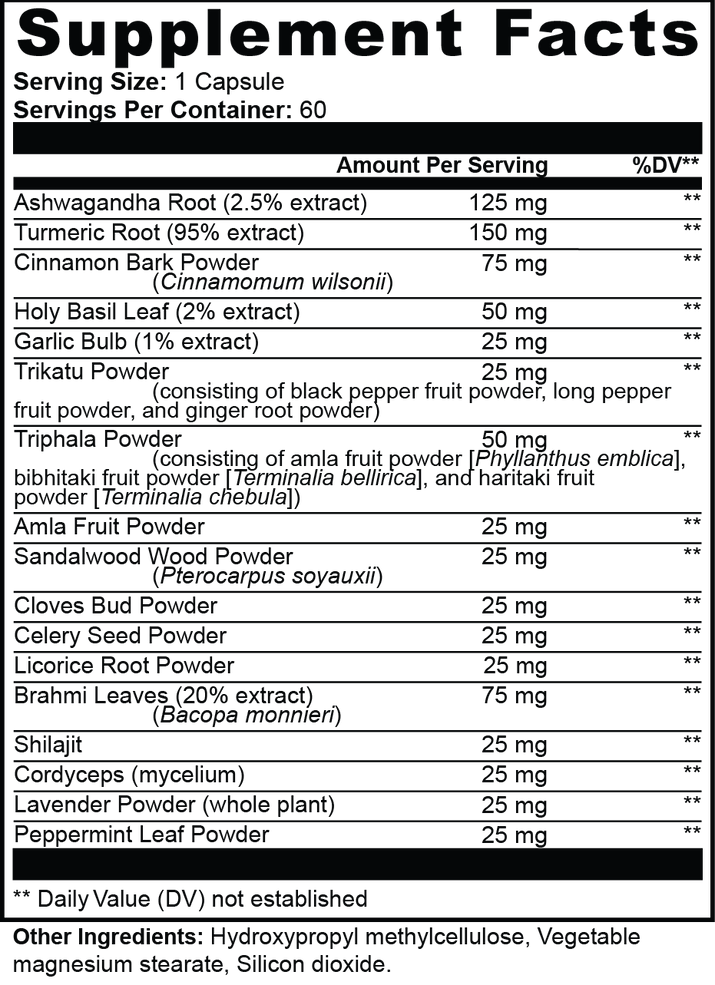 Ingredients: Ashwagandha Root (2.5% extract), Turmeric Root (95% extract), Cinnamon Bark Powder (Cinnamomum wilsonii), Holy Basil Leaf (2% extract), Garlic Bulb (1% extract), Trikatu Powder (consisting of black pepper fruit powder, long pepper fruit powder, and ginger root powder), Triphala Powder (consisting of amla fruit powder [Phyllanthus emblica], bibhitaki fruit powder [Terminalia bellirica], and haritaki fruit powder [Terminalia chebula]), Amla Fruit Powder, Sandalwood Wood Powder (Pterocarpus soyauxii), Cloves Bud Powder, Celery Seed Powder, Licorice Root Powder, Brahmi Leaves (20% extract) (Bacopa monnieri), Shilajit, Cordyceps (mycelium), Lavender Powder (whole plant), Peppermint Leaf Powder, Hydroxypropyl methylcellulose, Vegetable magnesium stearate, Silicon dioxide.