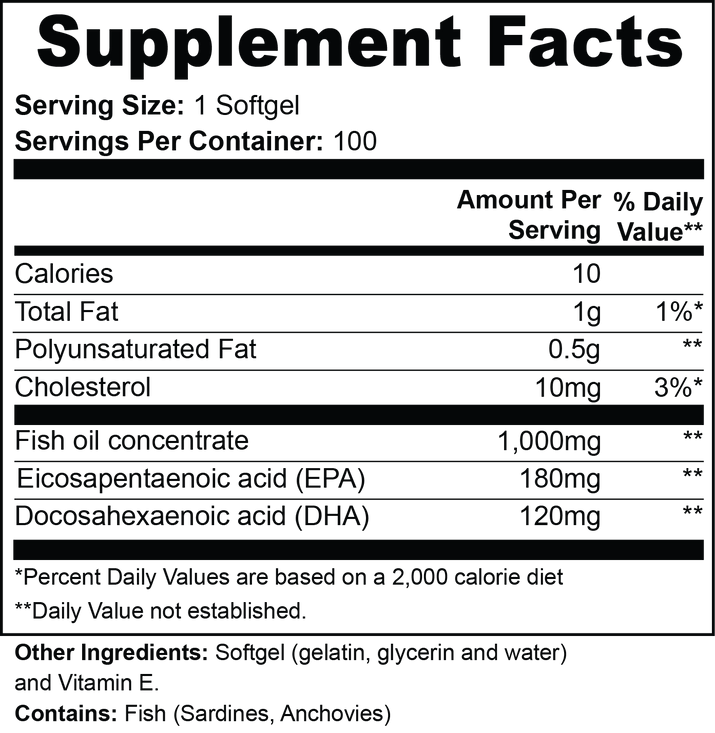 Ingredients: Fish oil concentrate, Eicosapentaenoic acid (EPA), Docosahexaenoic acid (DHA), softgel (gelatin, glycerin and water), Vitamin E.