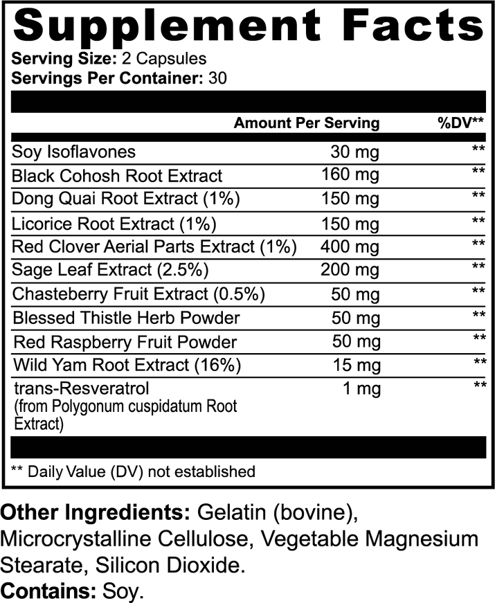 Ingredients: Soy Isoflavones (30 mg), Black Cohosh Root Extract (160 mg), Dong Quai Root Extract (1%) (150 mg), Licorice Root Extract (1%) (150 mg), Red Clover Aerial Parts Extract (1%) (400 mg), Sage Leaf Extract (2.5%) (200 mg), Chasteberry Fruit Extract (0.5%) (50 mg), Blessed Thistle Herb Powder (50 mg), Red Raspberry Fruit Powder (50 mg), Wild Yam Root Extract (16%) (15 mg), trans-Resveratrol (from Polygonum cuspidatum Root Extract) (1 mg), Gelatin (bovine), Microcrystalline Cellulose, Vegetable Magnesium Stearate, Silicon Dioxide.